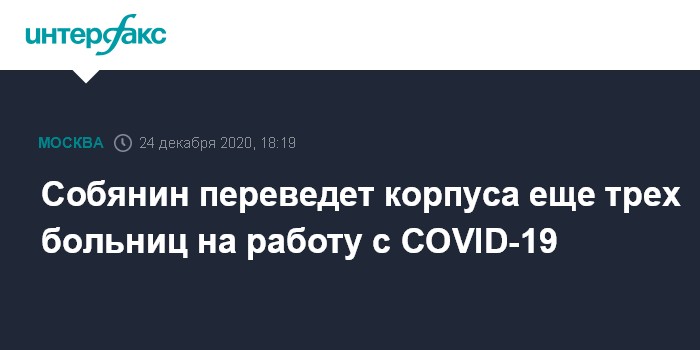 Москва. 24 декабря. INTERFAX.RU - В Москве из-за роста заболеваемости COVID-19 на работу с такими больными переведут крупные корпуса трех больниц, чтобы "подстраховать ситуацию", сообщил "России 24" мэр города Сергей Собянин.