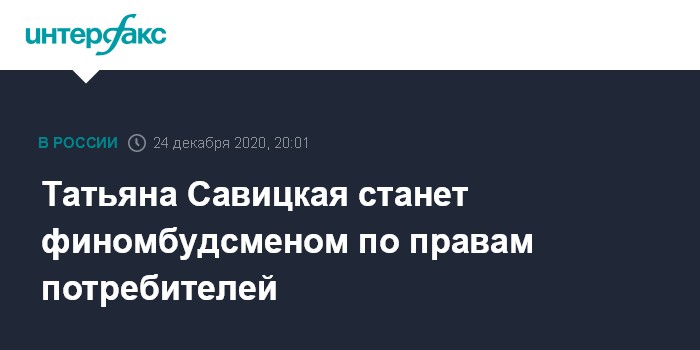 Москва. 24 декабря. INTERFAX.RU - Татьяна Савицкая с 2021 года назначена уполномоченным по правам потребителей финансовых услуг, говорится в сообщении Банка России.