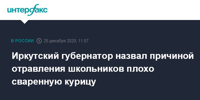 Москва. 25 декабря. INTERFAX.RU - Причиной ухудшения самочувствия учащихся школы №6 в Шелехове Иркутской области, часть из которых обратились в больницу с подозрением на острую кишечную инфекцию, по предварительным данным, стала недоваренная курица. Об этом заявил губернатор Игорь Кобзев.