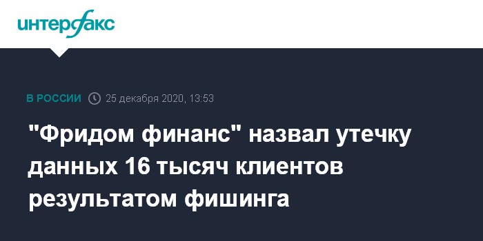 Москва. 25 декабря. INTERFAX.RU - Брокер "Фридом финанс" признал факт взлом своей внутренней сети и похищение утечки данных о 16 000 клиентах компании за 2018 год. Об этом в инстаграме сообщил основатель и гендиректор компании Тимур Турлов.