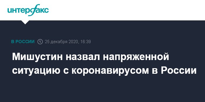 Москва. 25 декабря. INTERFAX.RU - Премьер-министр Михаил Мишустин считает, что ситуация с коронавирусом в стране остается напряженной. Он сказал это губернатору Петербурга Александру Беглову в ходе рабочей поездки в регион.