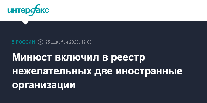 Москва. 25 декабря. INTERFAX.RU - Минюст внес в реестр нежелательных для России иностранных неправительственных организаций французскую "Ассоциацию школ политических исследований при Совете Европы" и "Пражский центр гражданского общества". Об этом сообщила пресс-служба ведомства.