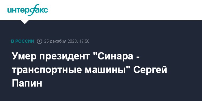 Москва. 25 декабря. INTERFAX.RU - Вице-президент, член совета директоров АО "Группа Синара", президент АО "Синара - транспортные машины" (СТМ) Сергей Папин скончался в возрасте 65 лет после продолжительной болезни, сообщили "Интерфаксу" в пресс-службе СТМ.