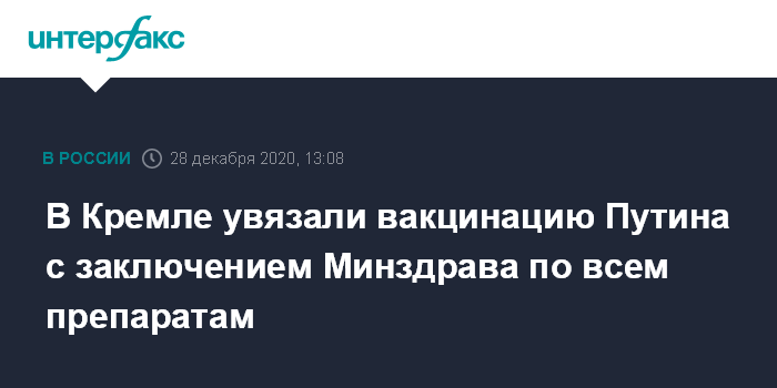 Москва. 28 декабря. INTERFAX.RU - Президент РФ Владимир Путин примет решение о вакцинации от коронавируса после того, как Минздрав России вынесет заключение не только по "Спутнику V", но и по другим вакцинам, уверен пресс-секретарь главы государства Дмитрий Песков.