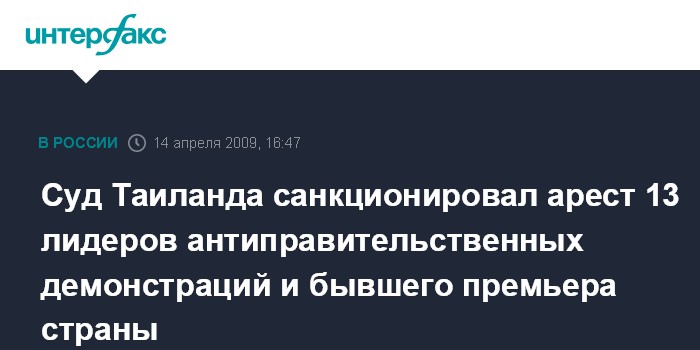 Москва. 14 апреля. INTERFAX.RU - Власти Таиланда выдали ордера на арест 13 лидеров и участников антиправительственных выступлений, а также бывшего премьер-министра Таиланда Таксина Чинавата, сообщает во вторник британская телерадиокорпорация BBC.