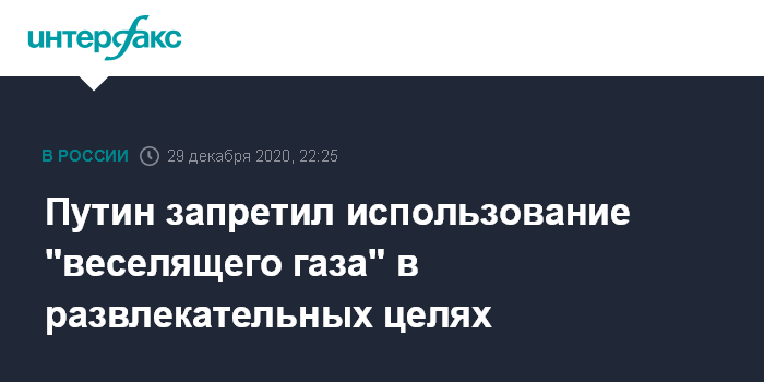 Москва. 29 декабря. INTERFAX.RU - Президент РФ Владимир Путин подписал закон, запрещающий использование, распространение и рекламу закиси азота в качестве одурманивающего препарата.