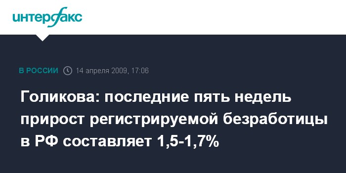 Голикова: последние пять недель прирост регистрируемой безработицы в РФ составляет 1,5-1,7%