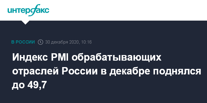 Москва. 30 декабря. INTERFAX.RU - В декабре 2020 года индекс PMI обрабатывающих отраслей России вырос до 49,7 пункта с 46,3 пункта в ноябре, показало исследование IHS Markit. Декабрьские результаты указали на продолжение ухудшения деловой конъюнктуры в обрабатывающих отраслях России, хотя и незначительное.
