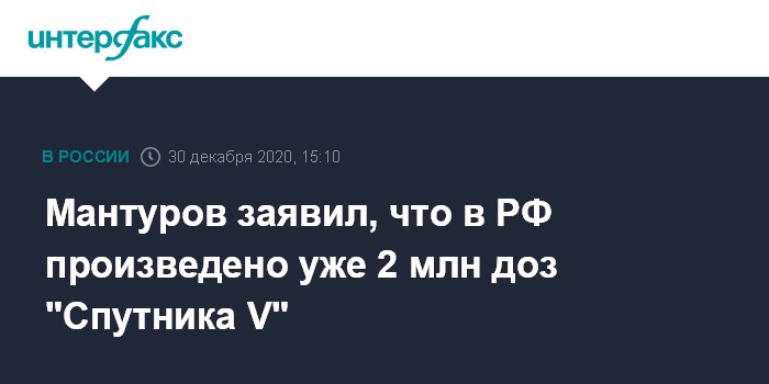Москва. 30 декабря. INTERFAX.RU - В РФ в настоящее время произведено 2 млн доз обеих компонентов вакцины от коронавируса "Спутник V", до конца текущего года в гражданский оборот будет введено более 1 млн доз вакцины, сообщает министр промышленности и торговли Денис Мантуров.