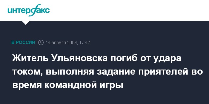 Москва. 14 апреля. INTERFAX.RU - В Ленинском районе Ульяновска произошел несчастный случай, жертвой которого стал 22-летний молодой человек. "Группа парней играла в очень популярную ныне экстремальную игру "Дозор". Молодые люди оставили в заброшенной, как им показалось, трансформаторной будке знак, а нашедший его парень попытался его взять. В результате он зацепился за оголенные провода и получил смертельную травму электрическим током", - сообщили агентству "Интерфакс-Поволжье" в пресс-службе УВД по Ульяновской области.