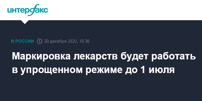 Москва. 30 декабря. INTERFAX.RU - Маркировка лекарств в России продолжит работать в упрощенном режиме до 1 июля 2021 года, сообщил оператор системы маркировки ЦРПТ.