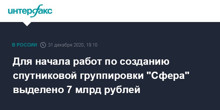 Москва. 31 декабря. INTERFAX.RU -Глава "Роскосмоса" Дмитрий Рогозин сообщил о выделении из бюджета 7 млрд рублей на начало работ по созданию спутниковой группировки "Сфера".