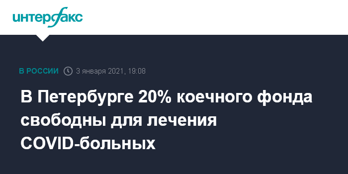 Москва. 3 января. INTERFAX.RU - Пятая часть коечного фонда Санкт-Петербурга, предназначенного для лечения больных COVID-19, остается свободна, сообщает межведомственный городской совет по противодействию коронавирусной инфекции в воскресенье.
