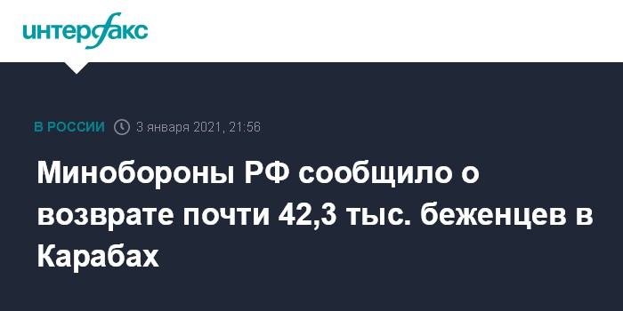 Москва. 3 января. INTERFAX.RU - Почти 42,3 тыс. жителей Нагорного Карабаха вернулись в свои дома при содействии российских миротворцев, сообщили в Минобороны РФ.