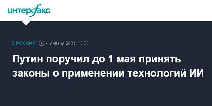 Правительству РФ поручено до 1 мая 2021 года обеспечить принятие федеральных законов, предусматривающих возможность установления в отдельных отраслях экономики и социальной сфере экспериментальных правовых режимов в целях расширения применения технологий ИИ.