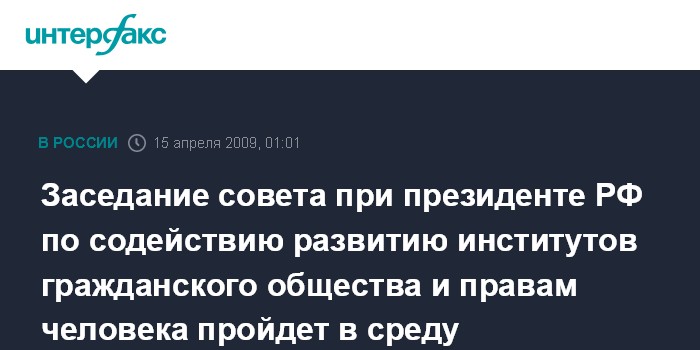 Москва. 15 апреля. ИНТЕРФАКС - Президент РФ Дмитрий Медведев проведет в среду заседание совета при главе государства по содействию развитию институтов гражданского общества и правам человека.