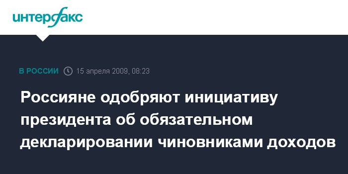 Москва. 15 апреля. INTERFAX.RU - Три четверти россиян (75%) поддерживают антикоррупционную инициативу президента, согласно которой чиновники должны декларировать свои доходы и доходы членов семьи.