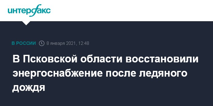 Москва. 8 января. INTERFAX.RU - Восстановлено энергоснабжение в Псковской области, прерванное 2 января из-за налипания мокрого снега на проводах, сообщает в пятницу министерство энергетики России.