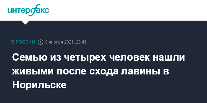 Москва. 8 января. INTERFAX.RU - Семью из четырех человек нашли живыми после схода лавины на горнолыжном курорте в Норильске, сообщил "Интерфаксу" информированный источник.