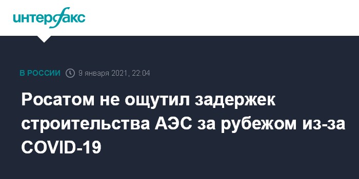 Москва. 9 января. INTERFAX.RU - ГК "Росатом" не ощутила задержек строительства АЭС на зарубежных проектах на фоне пандемии, заявил глава госкорпорации Алексей Лихачев в интервью телеканалу "Россия-24" в субботу.