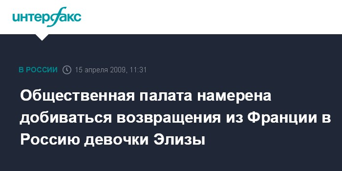 Москва. 15 апреля. INTERFAX.RU - Общественная палата будет добиваться возвращения из Франции в Россию дочери Ирины Беленькой Элизы.