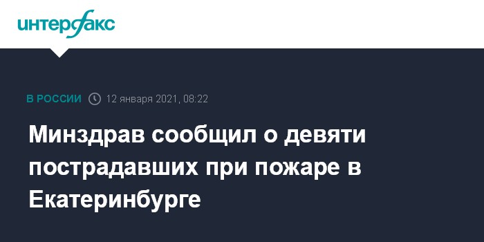 Москва. 12 января. INTERFAX.RU - В результате пожара в жилой многоэтажке в Екатеринбурге пострадали девять человек, в том числе один ребенок, сообщили в Минздраве Свердловской области. Погибли восемь человек.