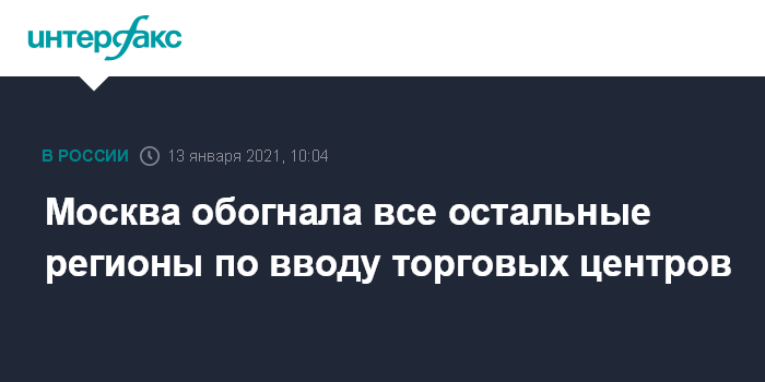 Москва. 13 января. INTERFAX.RU - Москва в 2020 году впервые за историю наблюдений обошла остальные регионы России совокупно по вводу новых торговых центров, сообщили в компании Cushman & Wakefield.