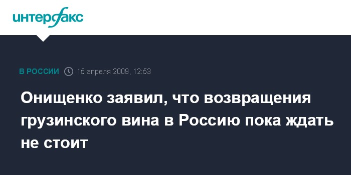 Москва. 15 апреля. INTERFAX.RU - Главный государственный санитарный врач России, глава Роспотребнадзора Геннадий Онищенко не видит пока никаких перспектив возвращения грузинского вина на российский рынок. "А что вы от меня хотите по возвращению грузинского вина, если посольство даже отсутствует?" - сказал Онищенко в среду на пресс-конференции в Москве, отвечая на вопрос по поводу возможных сроков возвращения.