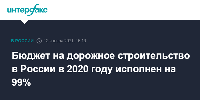 Москва. 13 января. INTERFAX.RU - Кассовое исполнение бюджета на дорожное строительство в России в 2020 году выросло с 95 до 99,1%, было освоено более 880 млрд рублей федеральных средств, сообщил вице-премьер Марат Хуснуллин на совещании у президента Владимира Путина.