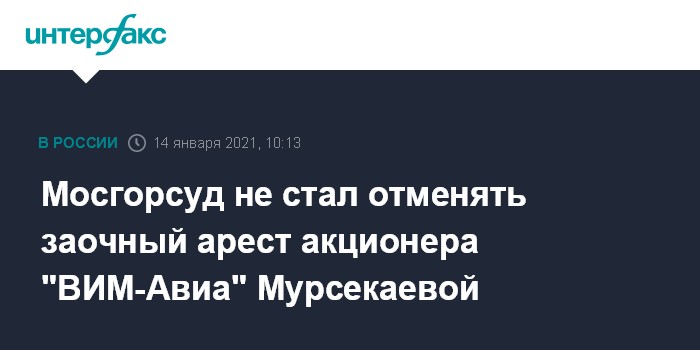 Москва. 14 января. INTERFAX.RU - Мосгорсуд оставил без изменений решение о заочном аресте совладелицы компании "ВИМ-Авиа" Светланы Мурсекаевой, сообщили в пресс-службе суда. Ее обвиняют в мошенничестве в сфере кредитования.