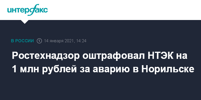Москва. 14 января. INTERFAX.RU - Енисейское управление Ростехнадзора назначило АО "Норильско-Таймырская энергетическая компания" максимально возможный штраф в 1 млн рублей по итогам расследования аварии на ТЭЦ-3 в Норильске, сообщает пресс-служба ведомства.