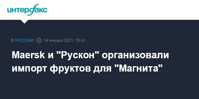 Москва. 14 января. INTERFAX.RU - Maersk, ООО "Рускон" (актив группы "Дело" Сергея Шишкарева и "Росатома", владеющей ПАО "Трансконтейнер"), ООО "Полярная звезда" (согласно системе "СПАРК-Интерфакс", по 50% у Станислава Бетина и Павла Ковальчука) и розничная сеть "Магнит" организовали ускоренную доставку импортных фруктов из Новороссийска в Москву.