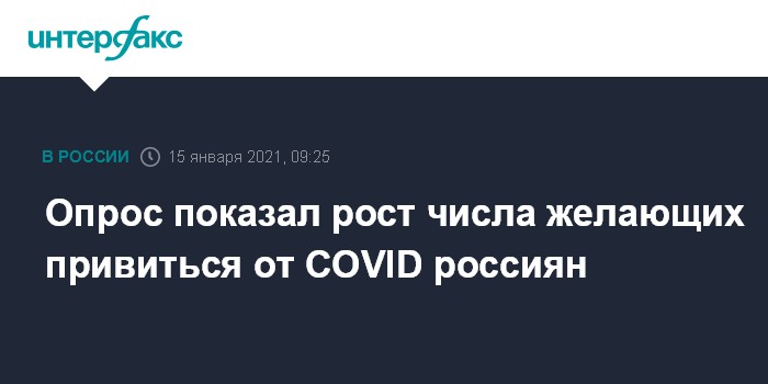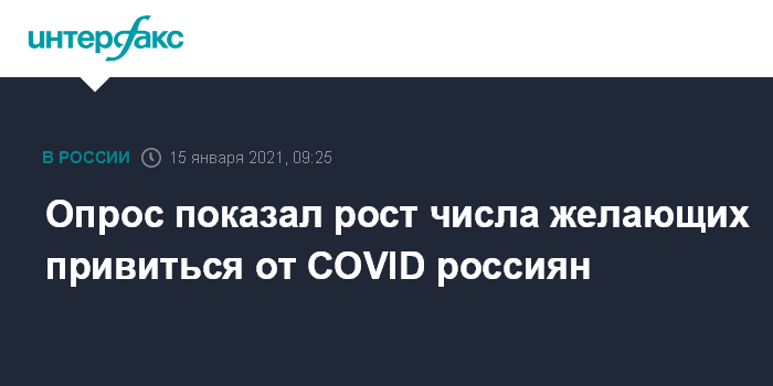 Москва. 15 января. INTERFAX.RU - Сделать себе прививку от коронавируса в настоящее время готовы 40% россиян, три недели назад такую готовность демонстрировал почти каждый третий (32%), свидетельствуют данные опроса Исследовательского центра портала SuperJob.ru, поступившие в пятницу в "Интерфакс".