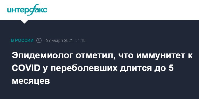 Москва. 15 января. INTERFAX.RU - Иммунитет у переболевших коронавирусной инфекцией сохраняется в среднем от трех до пяти месяцев, сообщил директор ФБУН "Центральный научно-исследовательский институт эпидемиологии" Роспотребнадзора Василий Акимкин.