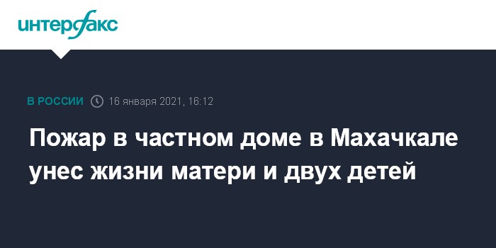 Москва. 16 января. INTERFAX.RU - Женщина и двое малолетних детей погибли, еще один ребенок пострадал во время пожара в частном доме в столице Дагестана Махачкале, сообщил "Интерфаксу" в субботу информированный источник.