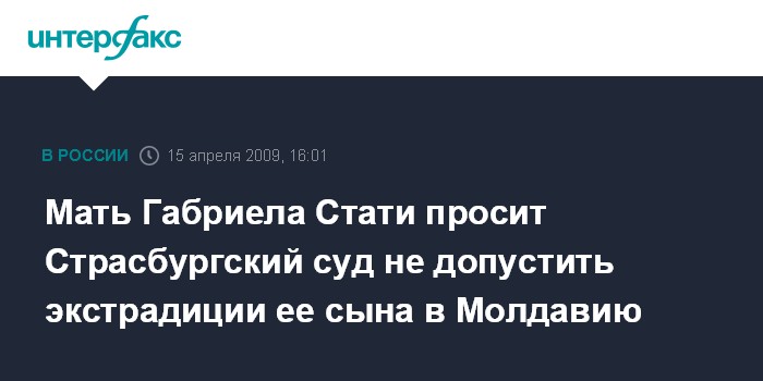 Кишинев. 15 апреля. INTERFAX.RU - Лариса Стати - мать бизнесмена Габриела Стати, которого молдавские власти обвиняют в организации беспорядков в Кишиневе, обратилась с просьбой к Европейскому суду по правам человека (ЕСПЧ) повлиять на Украину с целью не допустить экстрадиции ее сына из этой страны в Молдавию.
