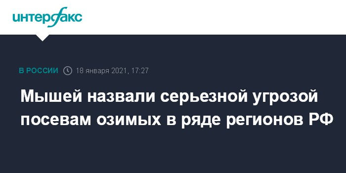 Москва. 18 января. INTERFAX.RU - Посевам озимых культур и многолетних трав в ряде регионов РФ серьезно угрожают мыши, следует из подготовленного Россельхозцентром фитосанитарного обзора по итогам 2020 года и предварительным прогнозам на 2021 год.