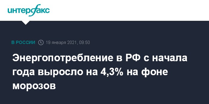Москва. 19 января. INTERFAX.RU - Потребление электроэнергии в России увеличилось с начала года на 4,3% на фоне холодной зимы, сообщил в эфире телеканала "Россия 24" (ВГТРК) замминистра энергетики РФ Евгений Грабчак.