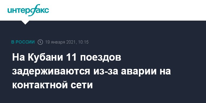Москва. 19 января. INTERFAX.RU - В Краснодарском крае на участке Туапсе-Адлер 11 поездов задерживаются из-за повреждения контактной сети, сообщила пресс-служба Северо-Кавказской железной дороги. Там уточнили, что сбой случился из-за того, что у станции Водопадный в 6:50 утра на провода упал посторонний предмет.