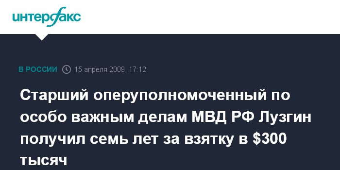 Москва. 15 апреля. INTERFAX.RU - Мосгорсуд приговорил к семи годам лишения свободы старшего оперуполномоченного по особо важным делам МВД РФ Дмитрия Лузгина, признав его виновным в получении взятки в размере 300 тыс. долларов.