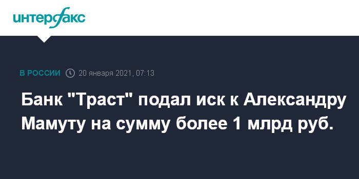 Москва. 20 января. INTERFAX.RU - Банк "Траст" (на его базе создан Банк непрофильных активов) подал иск к бизнесмену Александру Мамуту из-за невыплаты процентов по кредиту на сумму свыше 1 млрд рублей, сообщил "Интерфаксу" представитель банка.