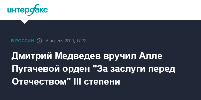 Москва. 15 апреля. INTERFAX.RU - Президент России Дмитрий Медведев вручил примадонне советской и российской певице Алле Пугачевой орден "За заслуги перед Отечеством" III степени и пожелал ей успехов на новом поприще.