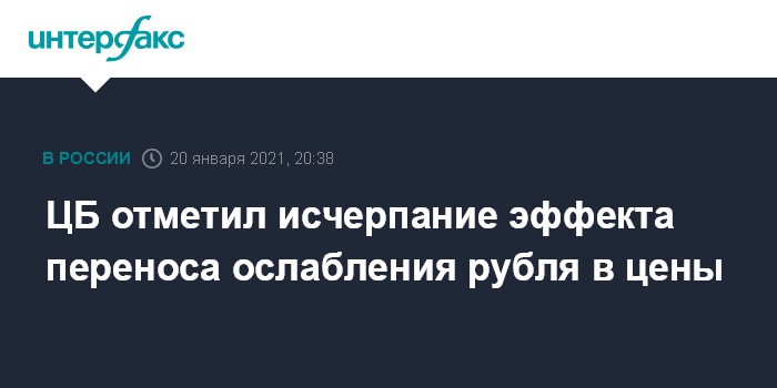 Москва. 20 января. INTERFAX.RU - Признаки постепенного исчерпания эффекта переноса произошедшего ослабления рубля в цены отмечались в декабре, говорится в комментарии Банка России по инфляции.