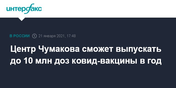 Москва. 21 января. INTERFAX.RU - Центр исследований и разработки иммунобиологических препаратов имени Чумакова планирует выпускать 7-10 млн доз вакцины от коронавируса в год, сообщил "России 24" гендиректор учреждения Айдар Ишмухаметов.