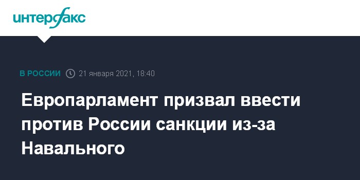 Москва. 21 января. INTERFAX.RU - В связи с арестом российского оппозиционера Алексея Навального Европарламент принял резолюцию с требованием ввести санкции против российских физических и юридических лиц и прекратить строительство газопровода "Северный поток-2". Резолюция с призывом к Совету ЕС носит рекомендательный характер.