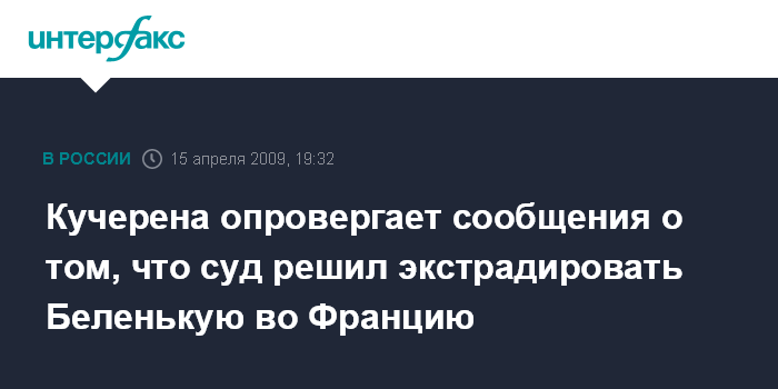 "Сообщения СМИ о том, что суд в Будапеште якобы принял решение об экстрадиции гражданки РФ Беленькой во Францию не соответствует действительности. Согласно сегодняшнему решению И.Беленькая оставлена под арестом на срок 40 дней, в течение которого французские власти должны представить все необходимые документы, касающиеся ее экстрадиции", - сказал Кучерена, сославшись на свой разговор с адвокатом россиянки Робертом Фридманом.