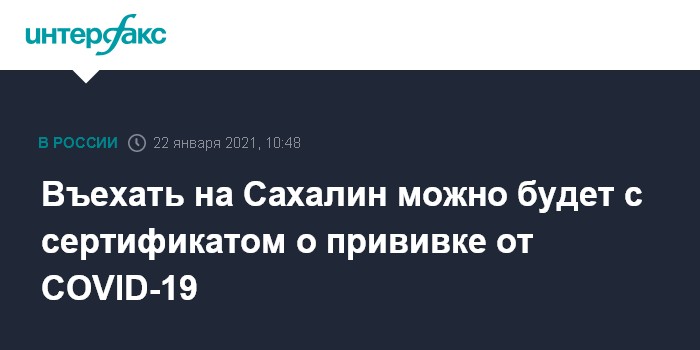 Москва. 22 января. INTERFAX.RU - Въехать в Сахалинскую область будет можно по предъявлении не только отрицательного теста на коронавирус, но и электронного сертификата о прививке, который можно будет получить на портале госуслуг. Об этом сообщила пресс-служба правительства региона.