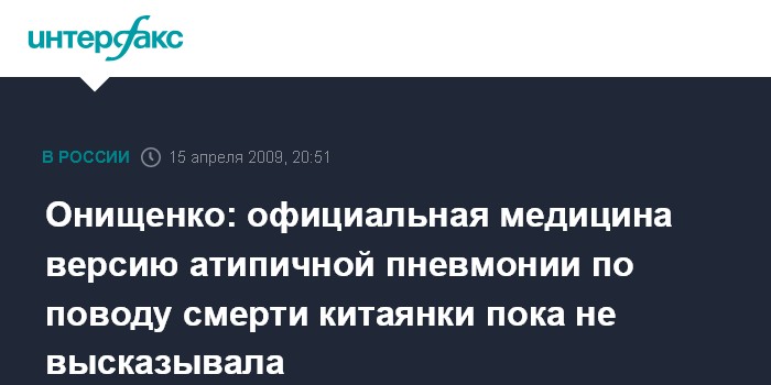 Онищенко: официальная медицина версию атипичной пневмонии по поводу смерти китаянки пока не высказывала