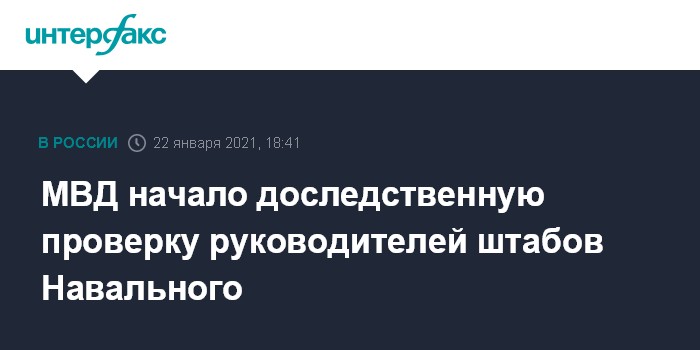 Москва. 22 января. INTERFAX.RU - В МВД начали доследственную проверку сигналов о том, что руководители региональных штабов Алексея Навального "занимаются организацией провокаций и насильственных действий", и эти действия широко освещаются в соцсетях, оппозиционных и иностранных СМИ. Об этом сообщила пресс-служба ведомства.