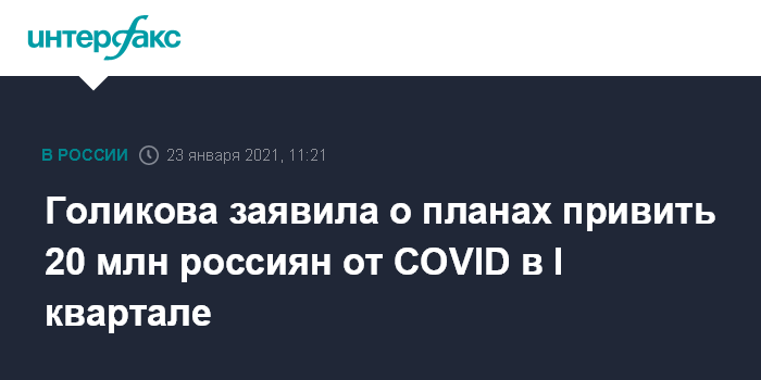 Москва. 23 января. INTERFAX.RU - Порядка двадцати миллионов россиян смогут привиться от коронавируса в первом квартале этого года, сообщила вице-премьер РФ Татьяна Голикова.